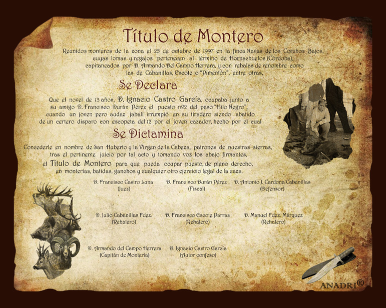 Título Montero impreso sobre lámina de papel 300g, simulando un manuscrito sobre un papel deteriorado, con un elegante reborde color burdeos que le aporta un toque distinguido (espectacular realismo), totalmente personalizable en texto e imágenes. Una vez realices la compra recibirás un formulario por email o whatsapp para que nos hagas llegar todo lo necesario para diseñarlo y además te mostraremos el boceto antes de imprimir la lámina para que des el visto bueno. No incluye marco. Se entrega en un tubo protector de cartón con tapas de seguridad. Tiempo de entrega estimado unos 15 días laborables. Sin duda el mejor detalle entre compañer@s monter@s o que pueda tener una orgánica con sus clientes o una peña con sus socios.